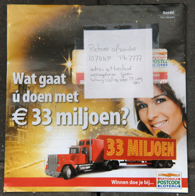 Van een trouwe lezer ontvingen we onderstaande foto: Gelukkig blijven er voor de goklustigen onder ons genoeg loterijen over. Doe dus net als onze lezer en stuur de reclame terug naar de afzender. Gewoon zoals op de afbeelding te zien is. Als u het in de bekende oranje brievenbus doet dan zorgt de post voor de rest.
